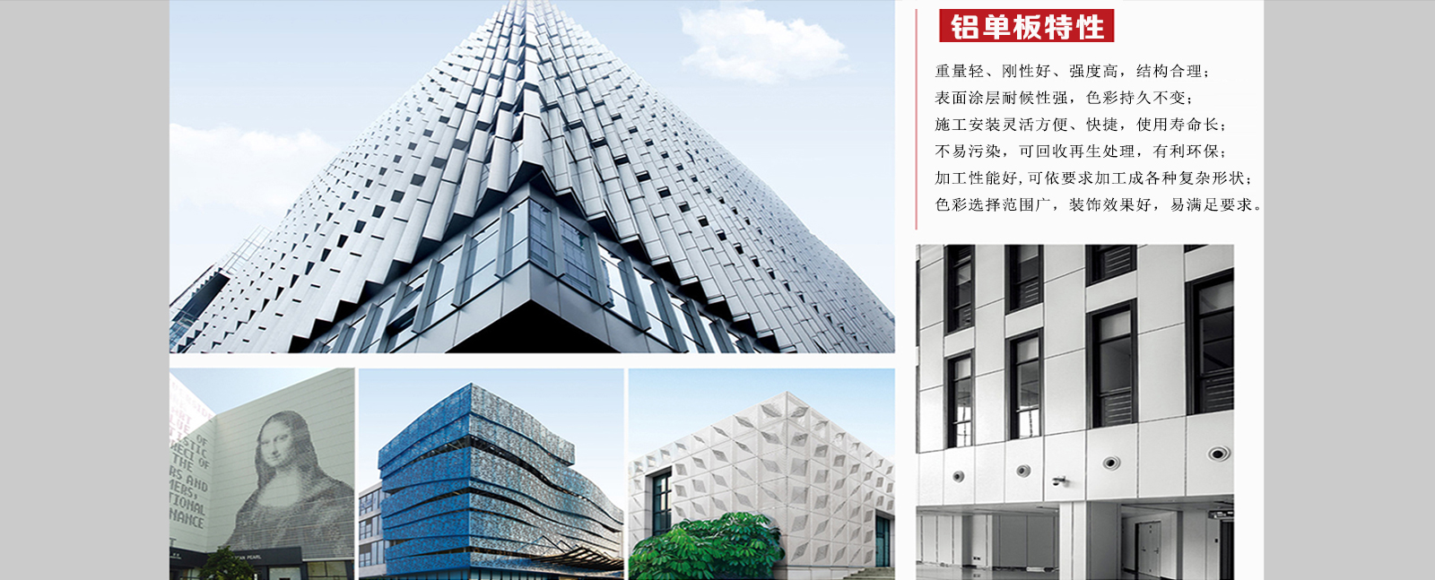 鋁單板工程案例山東.臨朐筑隆金屬制品有限公司的產(chǎn)品可應(yīng)用于:建筑物外墻、梁柱、門頭、陽(yáng)臺(tái)、雨棚、…